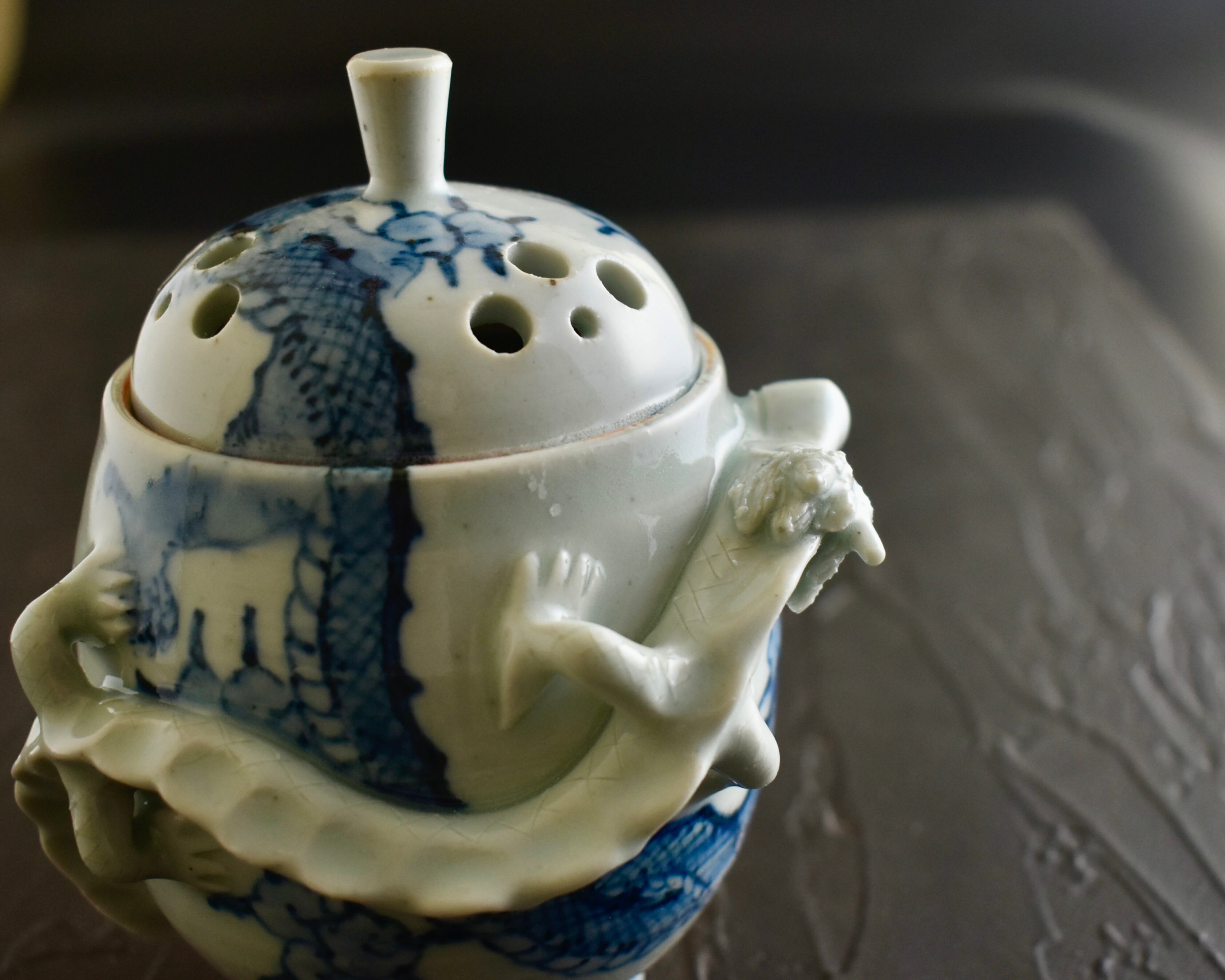 轆轤成形で作り、手捻りで作った龍を接着した一点物の香炉です。